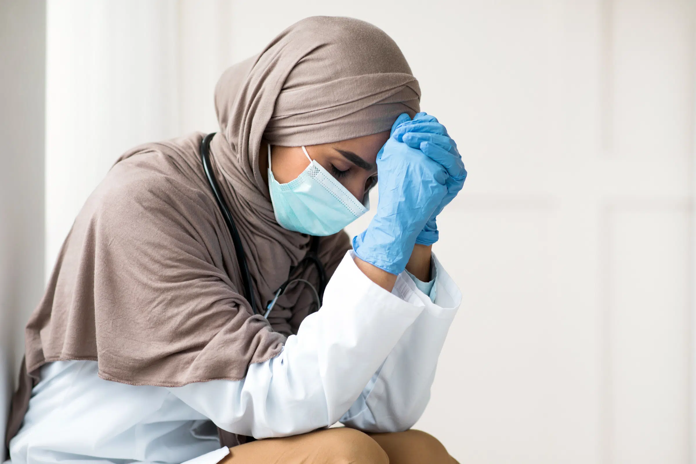 A Muslim doctor takes a moment to collect herself after an incident of religious persecution by a colleague.